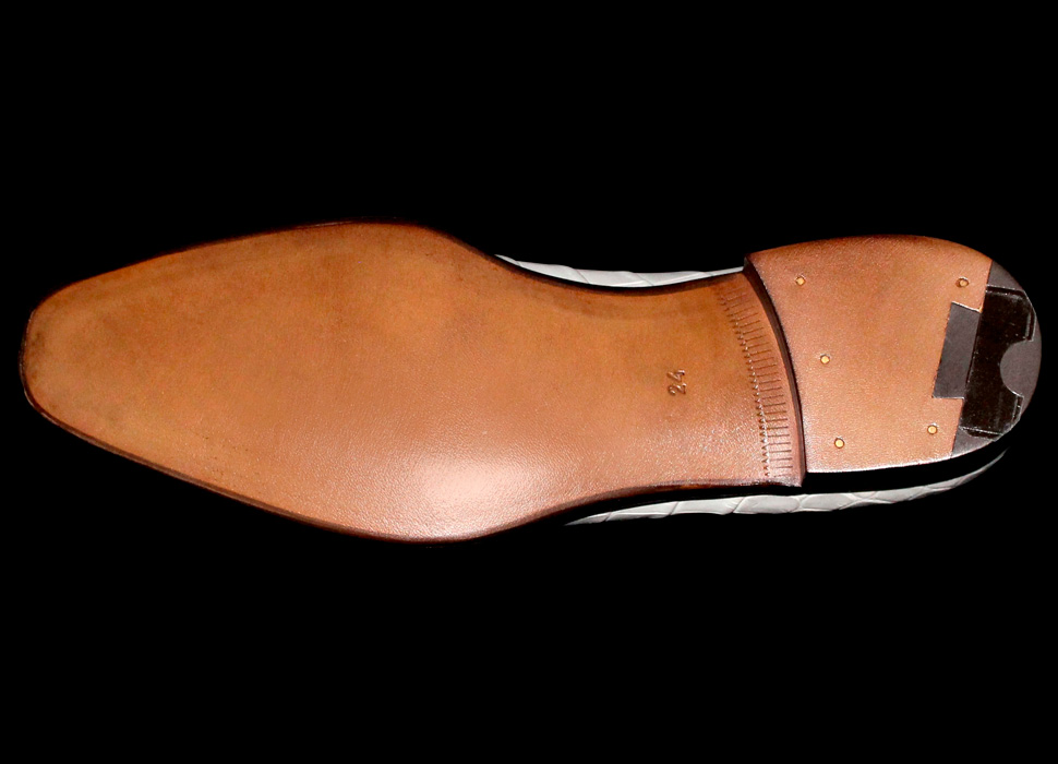 この靴の一番の特徴は、一枚のワニ革の中央部を大きく裁断し、それを贅沢に片足のみにあて、左右合わせた1足に2匹分のワニが使用されているところです。