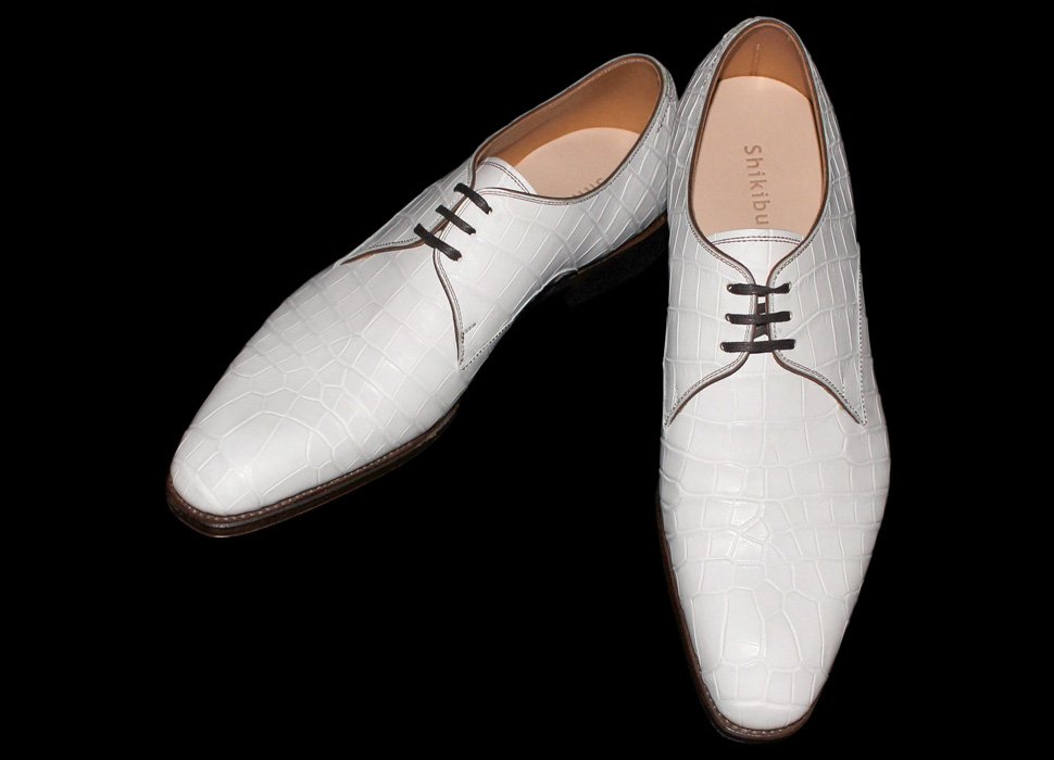 キズのない適正サイズのワニ革だけを選別し、すべての靴で左右対称の斑の綺麗な模様が再現されています。